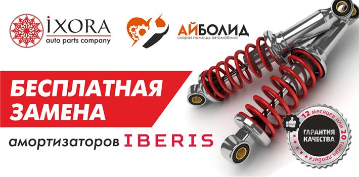 Закажите амортизаторы IBERIS в IXORA, и мы БЕСПЛАТНО* заменим их в сети автосервисов Айболид!